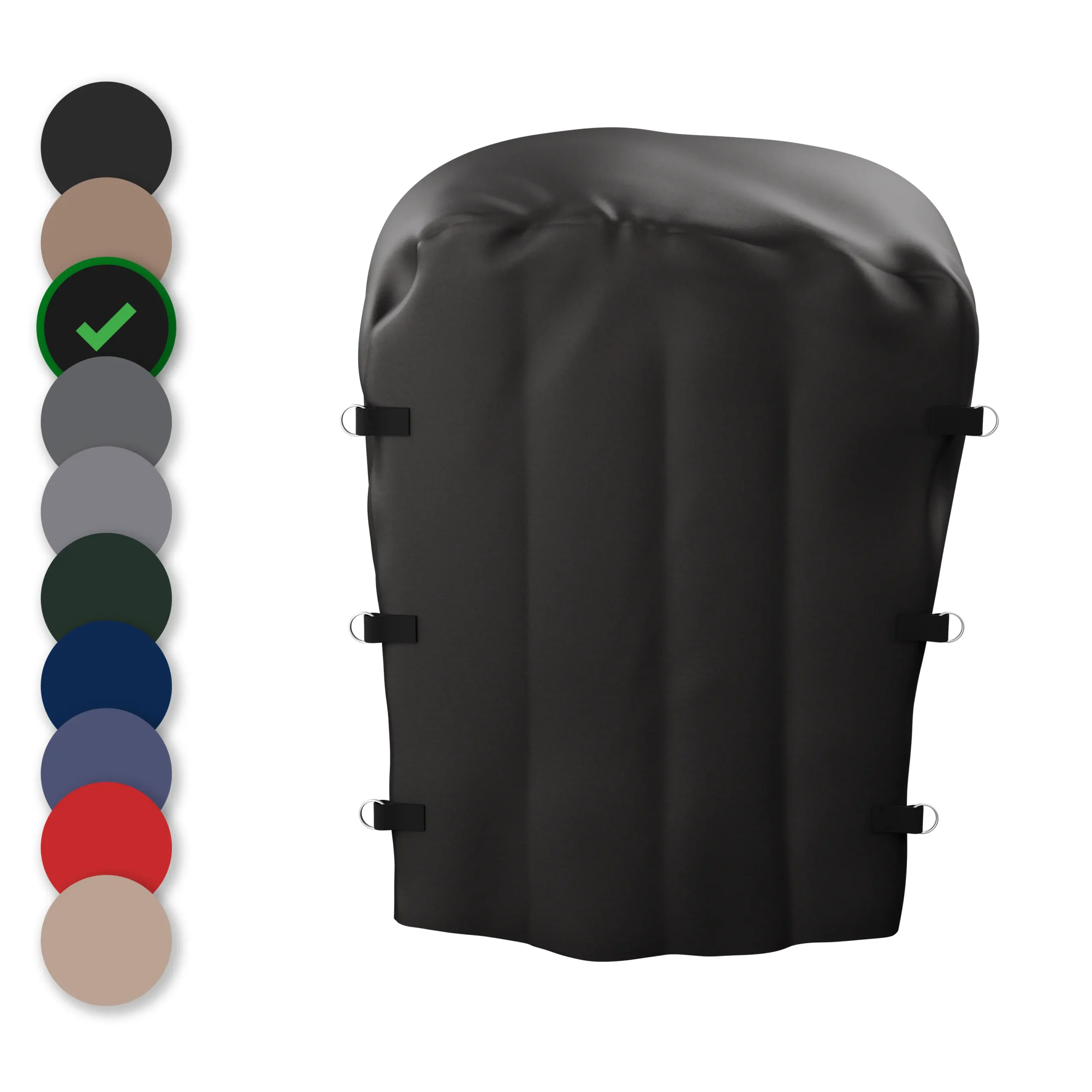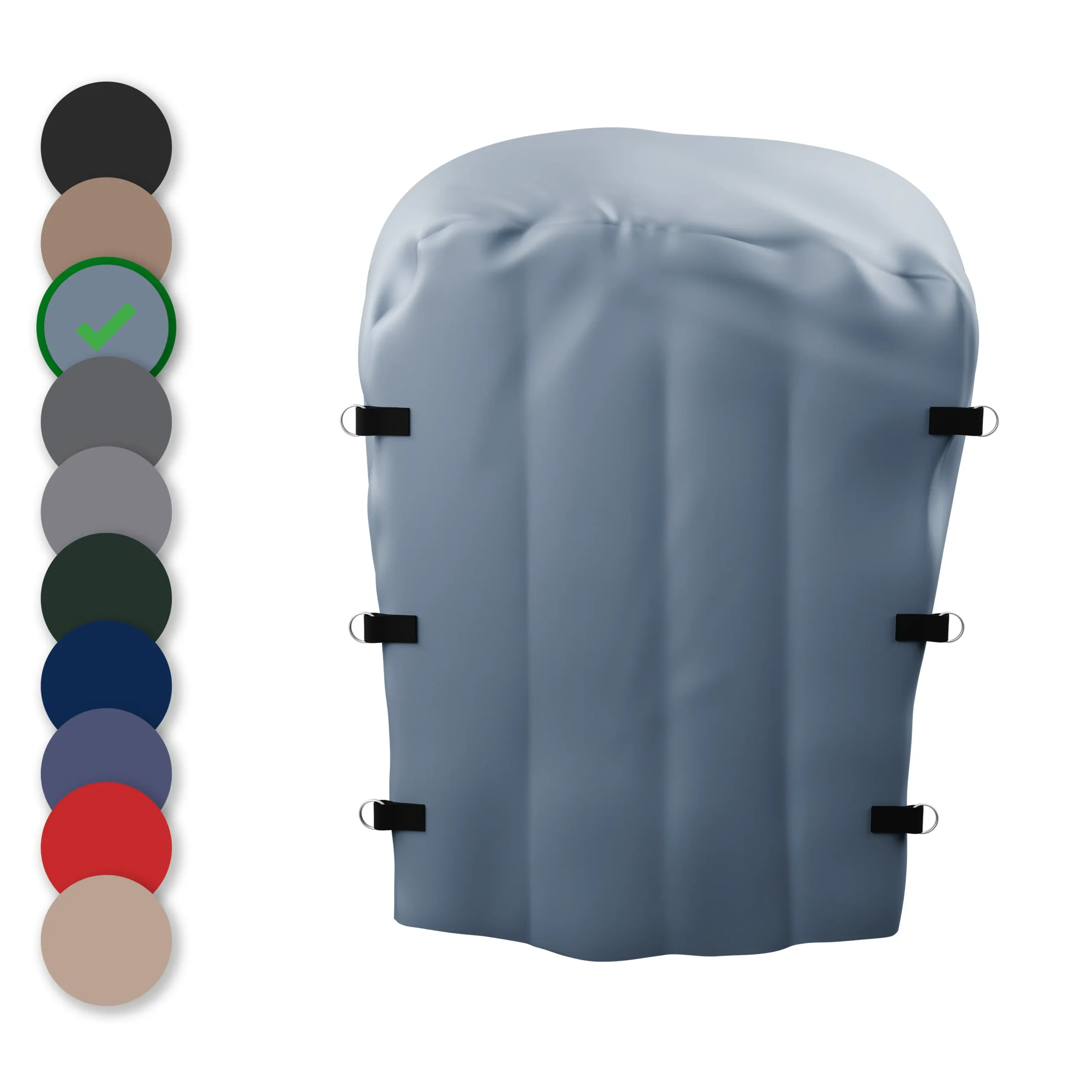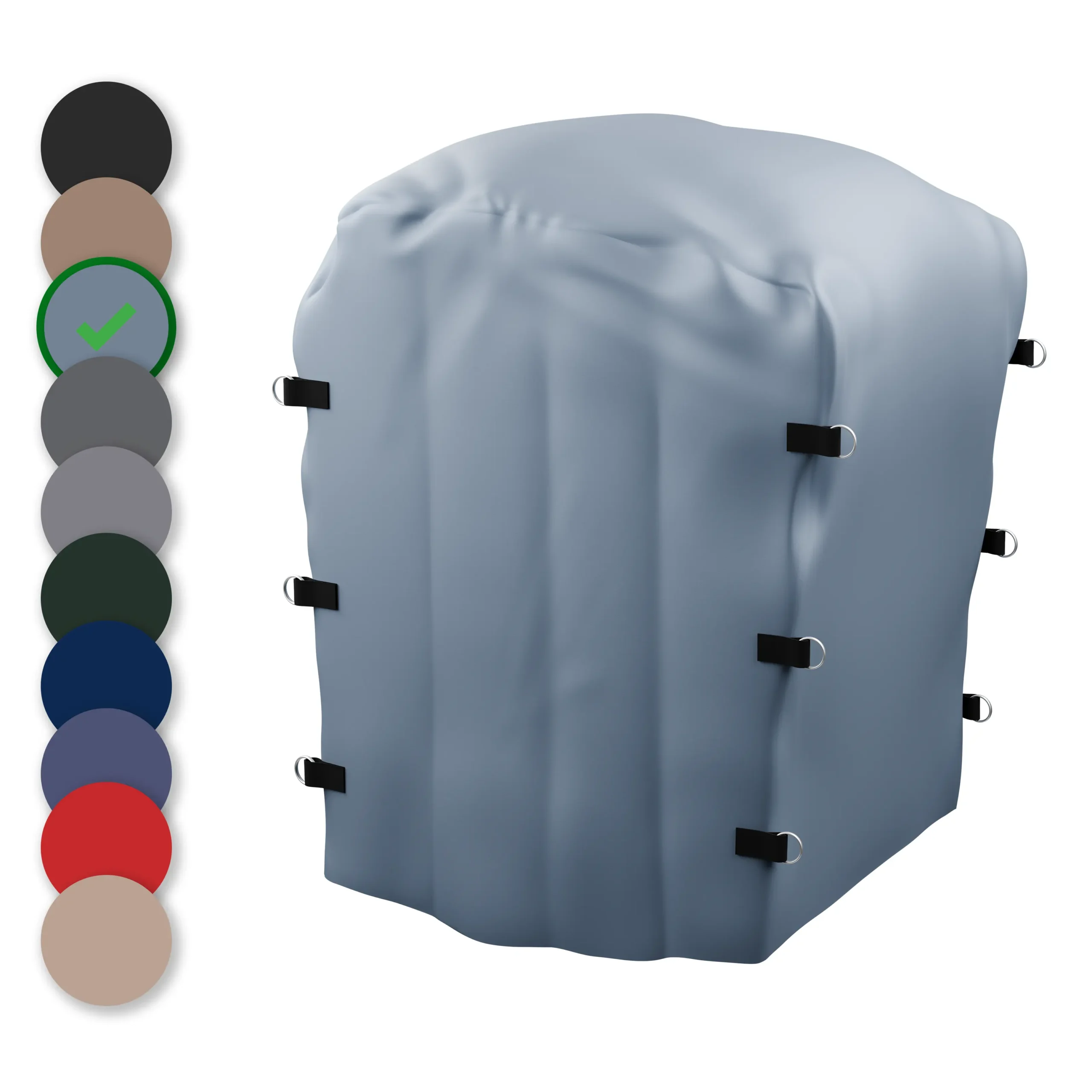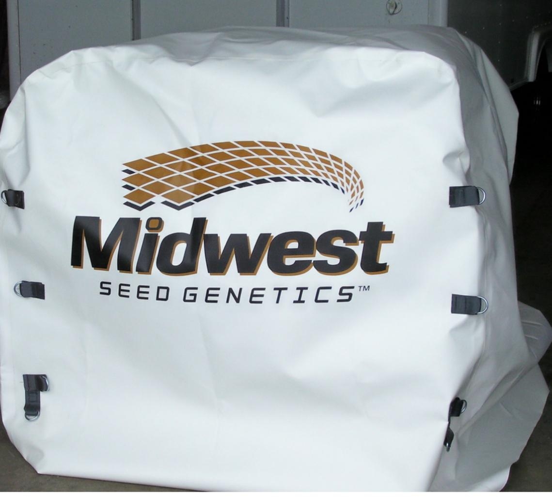 Our stock seed pallet covers are 61″ L X 51″ W X 59 1/2″ tall. We make our seed pallet covers out of a heavy duty 18 oz VCP (Vinyl Coated Polyester) Fabric. I sew in box stitched reinforced d-ring to tighten cover to pallet and horizontally across gusset to take wind whip out of cover. Seams are heat welded to protect cover from getting wet. Our covers are meant to keep seed dry. We avoid long stitched seams that invite leaking.
